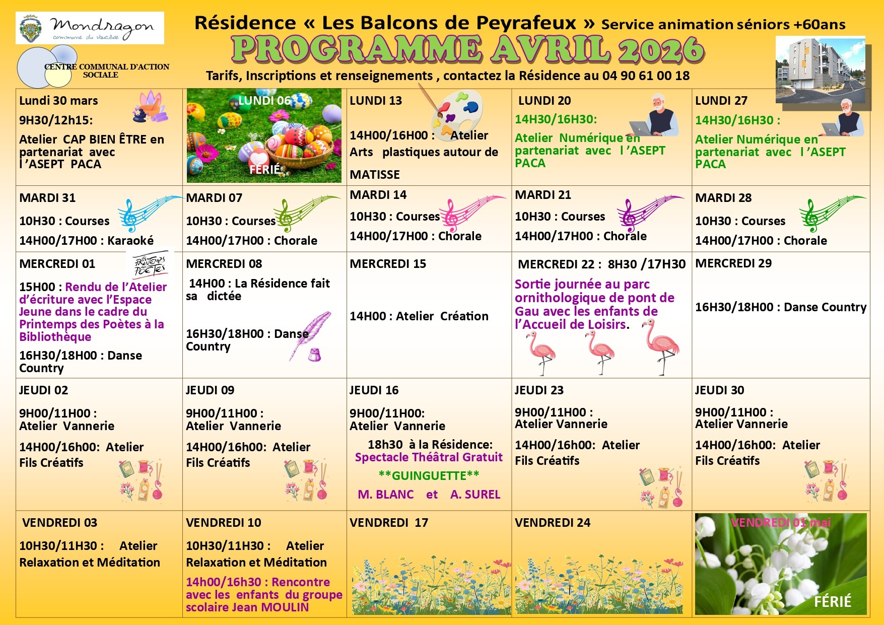 Afin que vous découvriez de nouveaux centres d’intérêts, les activités et les sorties qui vous sont proposées, sont programmées pour le mois et un flyer est à votre disposition à l’accueil de la Résidence, de la mairie et de l’espace culturel Jean Ferrat.