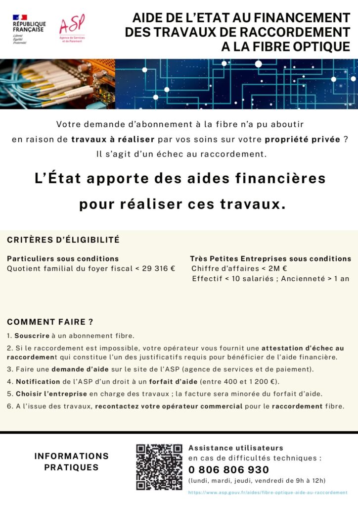 Besoin d’aide ou d’informations ? Assistance technique : 0 806 806 930 Plus d’informations : http://www.asp.gouv.fr/aides/fibre-optique-aide-au-raccordement 💡 𝘜𝘯𝘦 𝘢𝘪𝘥𝘦 𝘶𝘵𝘪𝘭𝘦 𝘱𝘰𝘶𝘳 𝘧𝘢𝘤𝘪𝘭𝘪𝘵𝘦𝘳 𝘭’𝘢𝘤𝘤𝘦̀𝘴 𝘢𝘶 𝘵𝘳𝘦̀𝘴 𝘩𝘢𝘶𝘵 𝘥𝘦́𝘣𝘪𝘵 𝘦𝘵 𝘢𝘤𝘤𝘰𝘮𝘱𝘢𝘨𝘯𝘦𝘳 𝘭𝘢 𝘵𝘳𝘢𝘯𝘴𝘪𝘵𝘪𝘰𝘯 𝘷𝘦𝘳𝘴 𝘭𝘢 𝘧𝘪𝘣𝘳𝘦 !